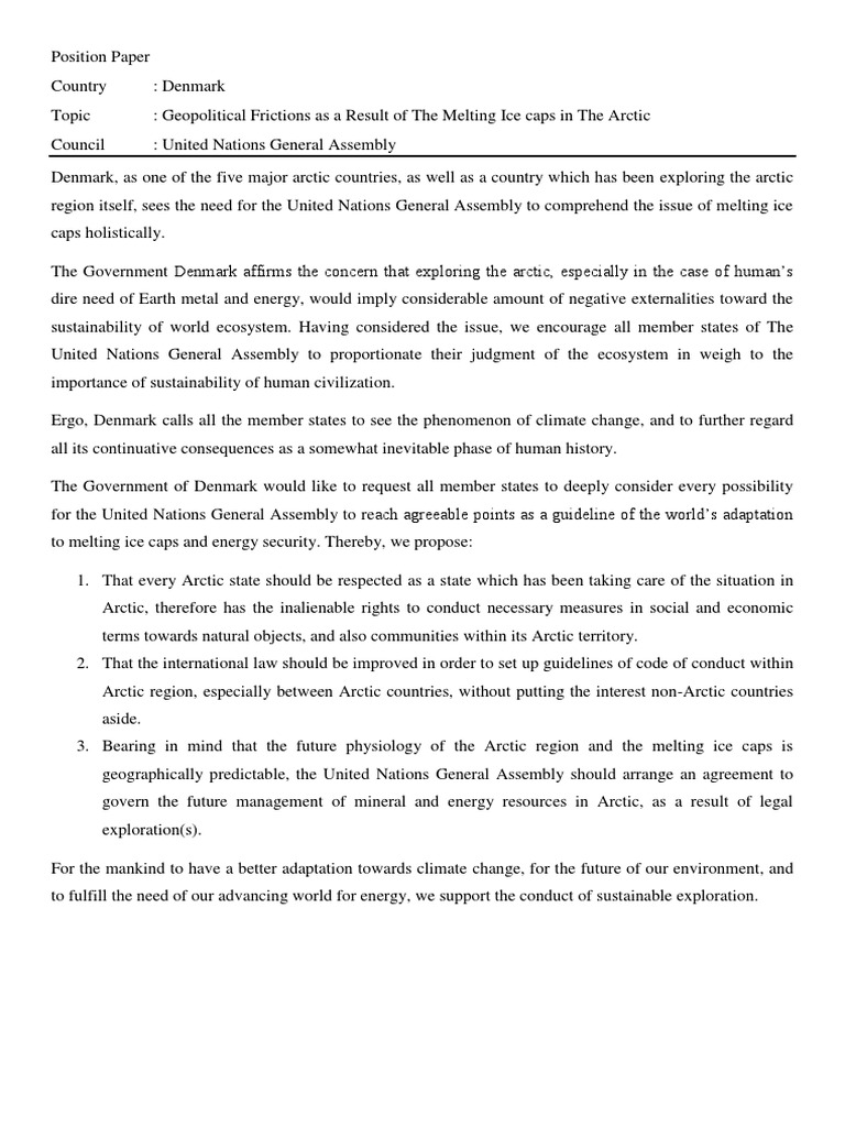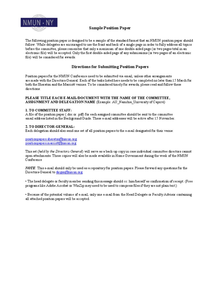 What is a sample position paper? Most model un conferences require delegates to submit a position paper, an essay covering a country's perspective on the assigned topics of a conference. · length may not exceed two pages. The position papers submitted here are formal, public statements of a delegation's position on the topics under consideration in a particular. Commission on human rights topic: Disarmament and international security topic: United nations security council country: Do you have enough material or proof to support your opinion? Please follow the format as provided in the sample position paper using the following standards: The universal declaration of human rights states, no one shall be subjected to torture. Mun position paper is a key part of getting ready for a mun conference. Nmun will not tolerate plagiarism, which includes copying. A position paper can be arranged in the following format: