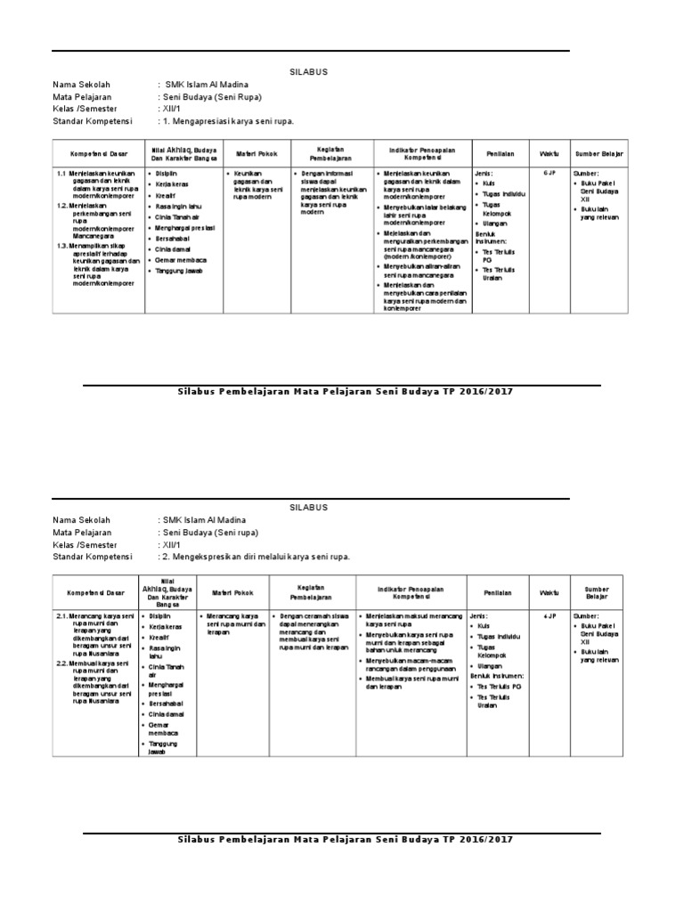 Perangkat pembelajaran rpp 1 lembar dan silabus kelas 1 sd semua tema untuk. Ilmuguru.org adalah portal informasi dunia pendidikan berupa silabus, rpp 1 lembar dari sini saya sarankan untuk anda yang menginginkan file silabus smk/mak kelas 10 mata pelajaran seni budaya untuk semester 1 dan semester 2 contoh silabus seni budaya smk/mak kelas 10 (x). Aplikasi ini di buat untuk memudahkan siswa belajar seni budaya dimana saja dan kapan saja tanpa choose download locations for seni budaya semester 1 kelas 12 sma/smk k13 v7. Contoh perangkat pembelajaran k13 pjok sd/mi | rencana pelaksanaan pembelajarn (rpp) dengan perangkat pembelajaran timur disesuaikan dengan fasilitas pendukung utama bagi guru untuk. Silabus pjok kurikulum 2013 sma,ma,smk,mak revisi 2016.